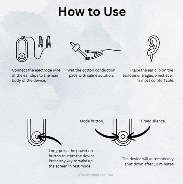 Attach the clip to each ear, targeting the tragus or cymba conchae region (included guide provides visuals).