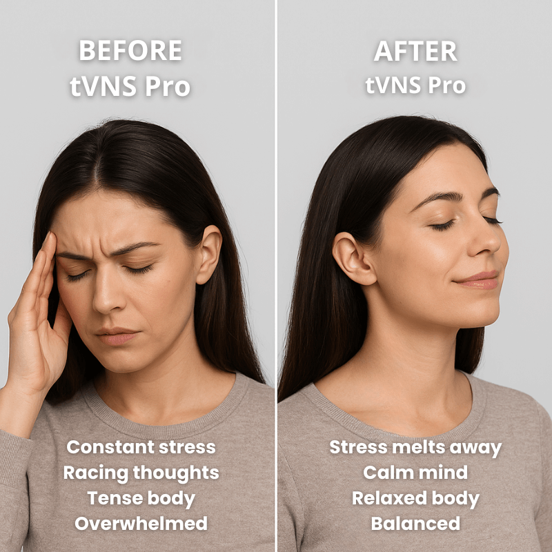The tVNS Pro uses gentle, low-frequency electrical pulses to stimulate the auricular branch of the vagus nerve through the skin of the outer ear. This method, known as transcutaneous vagus nerve stimulation (tVNS), is designed to support the body’s parasympathetic nervous system, which helps regulate stress, sleep, and emotional balance.